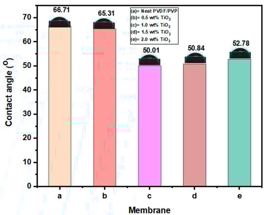 The contact angle is often used to describe the surface hydrophilicity [51]. The contact angle of the neat and modified membrane is shown in Figure 3. The addition of TiO2 nanoparticles into the polymeric dope solution produced a clear distinction in both hydrophilicity and flux [52]. The modified membrane with 1.0 wt% TiO2 concentration exhibited higher hydrophilicity with the lowest contact angle of 50.01°, while the neat membrane had a contact angle of 66.71°. Further increase in TiO2 loading (1.5 and 2.0 wt%) resulted in agglomeration of the nanoparticles within the membrane matrix, a decline in hydrophilicity, and a slight increase in the contact angle. This can be attributed to heterogenous distribution of the nanoparticles, a decrease in surface potential, and blockage of micropores on the membrane surface [53,54]. Based on these results and previous studies, the presence of TiO2 nanoparticles in the matrix structure of the modified PVDF membrane improves its hydrophilicity. Furthermore, researchers have also shown that most polymeric membranes with good hydrophilic properties have a higher propensity to resist fouling [48,55].