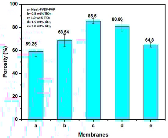 Membrane porosity is greatly influenced by TiO2 loading into PVDF dope, as demonstrated in Figure 4. The neat membrane (a) 0 wt% had the least porosity of 59.26%, while the modified membranes had higher values of 68.54%, 85.50%, 80.90%, and 64.90% for the dosages of (b) 0.5, (c) 1.0, (d) 1.5, and (e) 2.0 wt% membranes, respectively. The large jump in porosity from 59.26% to 85.50% at 1.0 wt% loading is due to the incorporation of TiO2 nanoparticles in the PVDF matrix, which led to an increase in surface hydrophilicity compared to the neat PVDF membrane [56]. The membrane with 1.0 wt% TiO2 loading is more hydrophilic, with a contact angle of 50.01°. The improved hydrophilicity makes the membrane more hydrophilic, which results in a significant increase in porosity and flux [53,57]. However, a further increase in TiO2 loading (1.5–2.0 wt%) results in a decline in porosity due to an increase in dope viscosity, which delayed the exchange rate between water and solvent, with resultant lower pore volume in the membrane structure [58,59]. However, the decrease in porosity observed with 2.0 wt% TiO2 loading might be due to the effect of agglomeration and high viscosity on the dope [60]. Therefore, it can be presumed that excessive loading of TiO2 onto the membrane dope weakens the formation of the pores and could considerably diminish the porosity as well as the permeability of the resultant membrane.