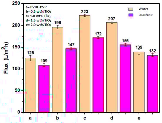 The permeate flux of the fabricated membrane at different TiO2 loadings is shown in Figure 5. The neat membrane recorded a flux of 125 and 109 L/m2·h for pure water and leachate filtration, respectively. In contrast, the modified membrane with the 1.0 wt% TiO2 loading recorded more superior flux, with a magnitude of 223 and 172 L/m2·h for the pure water and leachate filtration, respectively. This shows that the modification of the membrane matrix using the TiO2 nanoparticles significantly improved its hydrophilicity [52]. However, it was noticed that at higher loading of TiO2 nanoparticles (1.5 wt%), the flux for the pure water and leachate filtration declined to 207 and 156 L/m2·h, respectively. This is due to the agglomeration effect of the nanoparticles on the membrane matrix [32]. This can be attributed to heterogenous distribution of the nanoparticles, a decrease in surface potential, and blockage of micropores on the membrane surface [53,54]. Furthermore, the presence of agglomeration particles within the matrix structure could skew the surface area interaction of the additive (TiO2) and cause more roughness on the external part of the membrane [49]. Thus, this could relegate the hydrophilicity and then become more susceptible to fouling even at higher loading [32]. Membrane permeability could also be compromised due to blockage of pores, which hinders the passage of water [49]. Generally, the volume of flux in leachate filtration was noticeably smaller in comparison to pure water flux. This was perhaps due to the presence of more pollutants, particulates, and the colloidal matters in the leachate [22].