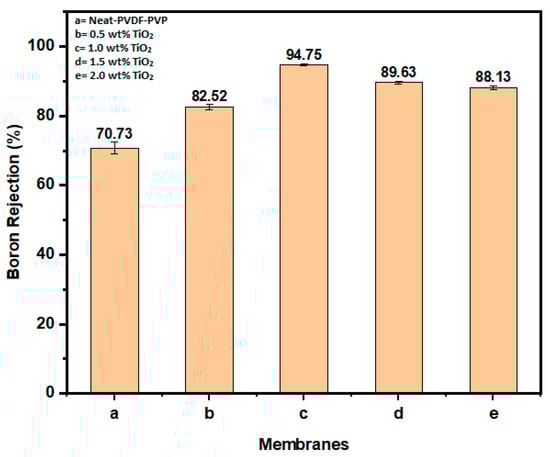 Boron rejection of neat PVDF-PVP (a) and membranes modified with TiO2 (b–e).