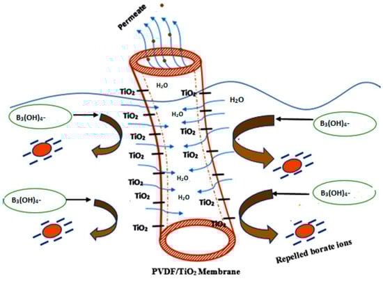 Boric acid is hard to be removed via size exclusion due to its low molecular size (0.4 nm), which is smaller than the membrane pore size [63]. The boron in the feed solution (leachate) exists as borate ion (B3(OH)4−) in alkaline conditions. In addition, the presence of dispersed TiO2 within the membrane matrix resulted in the formation of negative charges on the membrane surface [37]. Thus, the negatively charged borate ions were repelled upon approaching the membrane surface with like charges, resulting in high boron rejection [62]. The high jump in boron removal is attributed to high negative zeta potential recorded at 1.0 wt% TiO2 loading rate, which results in a more considerable amount of hydroxide groups and changes in the overall structure of the membrane. The resultant borate ion repulsion inhibits the accumulation of hydrophobic substances on the membrane surface and pore wall. Based on this rejection phenomenon, separation efficiency and fouling control are enhanced. Figure 7 demonstrates the repulsion mechanism between borate ions (B3(OH)4− and the TiO2 nano-modified membrane surface while water navigates and passes through membrane pore space and is collected as a permeate.