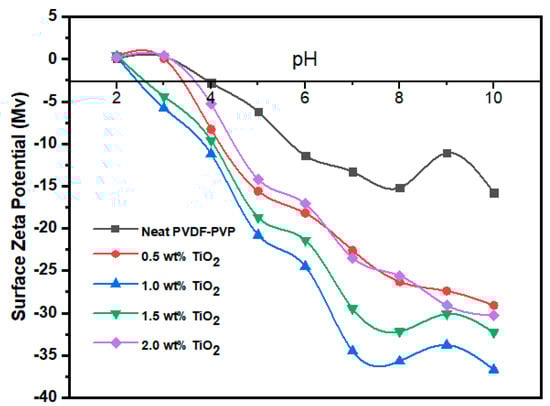 A zeta potential analyzer was used to assess the surface charge of the PVDF-PVP virgin and modified membranes. Figure 8 presents the surface zeta potential of the fabricated membrane at the varied broad range of 2–10 pH. As depicted in Figure 8, the membrane matrix became more negatively charged alongside increasing TiO2 loading. The TiO2 exposed to the membrane surface was hydrolyzed to form a hydroxide functional group in the presence of water. The protonation of TiO2 resulted in the deprotonation of the membrane surface [64]. Noticeably, the membrane with 1.0 wt% TiO2 loading recorded the highest negative zeta potential charge at pH 10, with a value of −36.7 Mv. This is as a result of homogenous dispersion of the nanoparticles within the membrane matrix structure. The high jump in boron removal is attributed to the high negative zeta potential recorded at the 1.0 wt% TiO2 loading rate, which results in a more considerable amount of hydroxide groups and changes in the overall structure of the membrane.