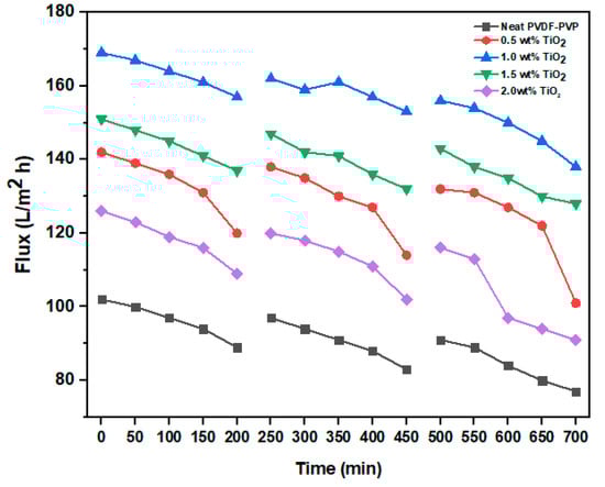 Figure 9 presents the results of flux in three cycles of filtration with respect to time. Generally, a decline in flux was noticed for both PVDF neat and modified membranes for the dosages of (a) neat, (b) 0.5, (c) 1.0, (d) 1.5, and 2.0 wt% with time due to the deposition of foulants on the membrane surfaces. It was also observed that the neat PVDF membrane had a flux of 89 L/m2·h, while the modified membrane (1.0 wt%) had a flux of 157 L/m2·h after 200 min filtration. The flux further declines to 77 and 138 L/m2·h after the 700 min filtration period, respectively.