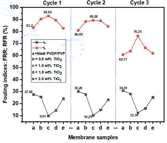 Generally, the %RFR and %FRR deteriorated along the filtration cycles. The first cycle filtration recorded higher %FRR than the second and third cycles due to fouling. The good antifouling performance of the modified membranes was due to the blending of TiO2 nanoparticles into the membrane matrix. This is because hydrophilic nanoparticles have the potential to repel hydrophobic contaminants, thereby enhancing the antifouling property of the membrane [65,66,67].