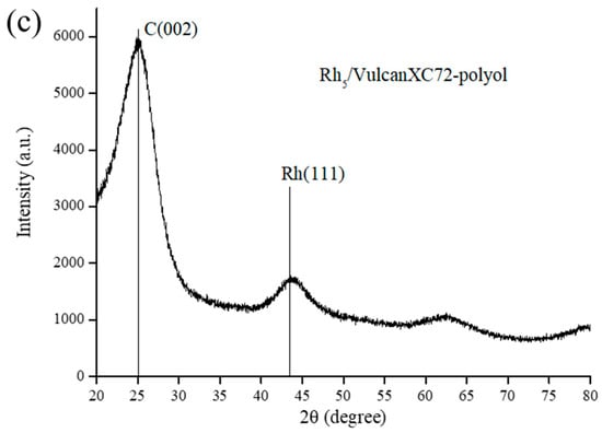N2 sorption isotherm of VulcanXC72 revealed a type IV hysteresis loop, typical of mesoporous materials [8]. Virgin VulcanXC72 possessed a BET surface area of 232.8 m2/g with a pore diameter and pore volume of 13.6 nm and 0.47 cm3/g, respectively. After doping with Rh, the BET surface area of Rh5/VulcanXC72-polyol reduced slightly by 4.1% to 223.3 m2/g. The negligible reduction in surface area of VulcanXC72 indicated that the majority of Rh nanoparticles (NPs) were located on the outer surface of VulcanXC72, thus inhibiting severe pore blockage. The HRTEM image of Rh5/VulcanXC72-polyol shown in Figure 1a further confirms that Rh was located majorly on the outer surface of the catalyst, as indicated by the white arrows. Rh5/VulcanXC72-polyol possessed a Rh particle size of 3.4 ± 0.9 nm, as calculated from its HRTEM image (Figure 1b). It was also speculated that the rapidness of the polyol synthesis method might have played a part in ensuring that the location of Rh was mostly on the outer surface of VulcanXC72 by not allowing enough time for the Rh NPs to diffuse and deposit themselves inside the pores of VulcanXC72. XRD analysis of Rh5/VulcanXC72-polyol was also performed and the corresponding X-ray diffractogram can be seen in Figure 1c. The X-ray diffractograms of Rh5/VulcanXC72-polyol revealed broad and not very discernible peaks for Rh (111) and was attributed to the small size and good dispersion of Rh NPs obtained due to polyol synthesis.