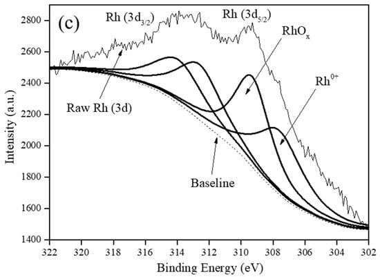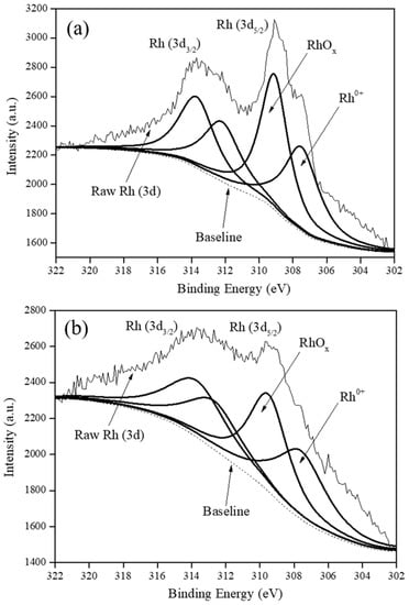 Figure 3 shows the deconvoluted XPS spectra of all the various carbon supported Rh catalysts in the Rh (3d5/2) and Rh (3d3/2) regions with BEs from 302.0–311.9 eV and 312.0–320.0 eV, respectively [8,15].