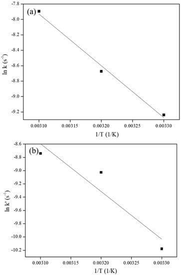 Plot of (a) ln k vs. 1/T (for hydrogenation yield) and (b) ln k’ vs. 1/T (for epoxy ring opening).