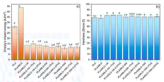 | PLA/MLO-10W-1TVS | 81.4 ± 1.7 d | 45.04 ± 0.98 e | 7.86 ± 1.46 d,e | 22.82 ± 1.32 d,e | 22.7 ± 1.7 g,h |