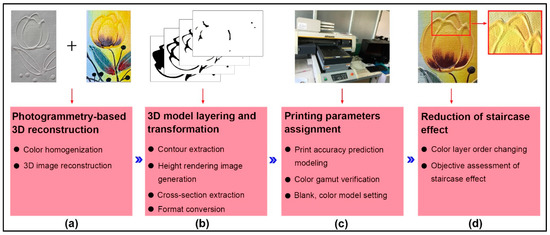 Color is a core attribute of physical 3D objects, and its accurate reproduction becomes a tough challenge in additive manufacturing in recent years [1,2,3,4]. The color 3D printing is an advanced stage of the additive manufacturing process with vivid surface texture reproduction, which provides more authentic features of functional 3D fabrications in various industries [5]. Material jetting is one of seven additive manufacturing techniques with polymer-based materials according to the ISO/ASTM 52900 [6]. In addition, since the release of a UV inks jetting system based on the material jetting principle, its use in color 3D printing has been explored from three primary inks to six primary inks and even more spot color inks [7]. Meanwhile, the demand for high-fidelity oil paintings is increasing, but traditional manual copying methods and graphics printing techniques are difficult to reproduce the microscopic details of an oil painting quickly and accurately [8,9]. These methods easily ignore the fact that any oil painting is a 2.5D/3D object with variable thickness, thus losing the valuable signatures from the various microscopic variations in the digital acquisition of the oil painting [10]. With the launch of microscopic 3D scanning systems and the optimization of acquisition algorithms, 3D scanning data of oil paintings can be accurately acquired in a short period of time [11]. However, due to the complex color information contained in the color 3D model formed from the 3D scan data of the oil painting and the maximum print accuracy limitations of current color 3D printers, the color boundaries of the reproduced oil painting suffer from the sticky staircase effect, which destroys the high fidelity [12,13,14].