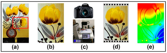 Diagram of 3D reconstruction of a specific area in an oil painting: (a) original oil painting; (b) target area; (c) key devices; (d) control grid array; (e) height contour rendering.