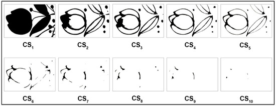 Currently, the measured average printed thickness of C ink is 11.0 μm, the average printed thickness of M ink is 13.2 μm, the average printed thickness of Y ink is 7.9 μm, the average printed thickness of K ink is 9.0 μm, and the average printed thickness of W ink is 13.7 μm. The difference in thickness of the different color inks is mainly due to their specific pigment density. As the pigment density in the ink increases, the thickness of each colored layer increases. Viscosity is also a positively correlated variable, but there is a limit value for each color ink. The current viscosity of color inks is controlled in the range of 15–30 cP (25 °C) from the ink company, but no specific value is measured in this experiment. Since the minimum thickness of a single sliced layer is determined by the minimum resolution of printable accuracy and the limit of the human eye, the thickness of the sliced layer is consequently set to 100.0 μm. The maximum thickness of the selected oil painting is 1240.0 µm. The purpose of generating the contours of an oil painting model was to extract contours of different height sections for model layering with the above-mentioned thickness. The height rendering image generation was to assign relative hues and tones to each extracted height contour rendered by jetting UV inks, as shown in Table 1. Subsequently, each cross-section was segmented and extracted from this rendering consisting of ten coloring layers, which are illustrated in Figure 3, and saved as the “.eps” format file that can be recognized by the Mimaki UV inks jetting system.