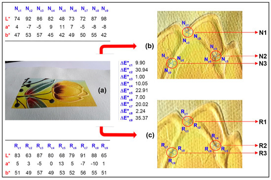A new method of reverse-sequence printing of coloring layers was proposed to improve the staircase effect on the printed surface of oil paintings. The change from the normal sequence printing method was that the white ink was printed from the top layer and then the bottom layer; all other printing parameters were the same. Thus, the above three specimens were placed under a lamp cabinet to subjectively evaluate the reproduction effect of the yellow flower oil painting, and the areas with significant edge changes were selected for objective evaluation of the staircase effect utilizing the color difference metric. The CIEDE*ab formula is to acquire the chromatic aberration of two colors on 3D-printed oil painting [42], which is shown in Equation (1).