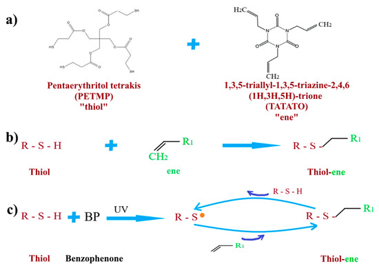 Thiol-ene reaction. (a) molecular formulas of PETMP and TATATO; (b) and (c) mechanism of thiol-ene reaction.