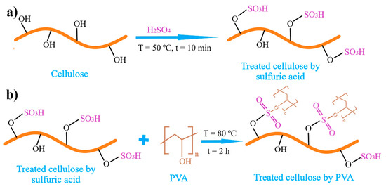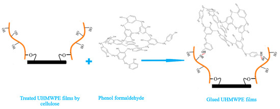 The cellulose nanoparticles surface was modified by sulfuric acid (65%) for 10 min at the temperature of 50 °C (Figure 2a) with a ratio of 1.5 mL of the sulfuric acid for each gram of the cellulose. Then, the cellulose nanoparticles were washed and filtered by distilled water to quench the reaction and to remove the remaining acid or neutralized salt. PVA solution in distilled water was prepared by heating the solution at 80 °C for 1 h. Then, the modified cellulose nanoparticles were added to PVA solution and stirred at the temperature of 80 °C for 1 h with a ratio of the PVA/cellulose 1/0.25 (Figure 2b). The thickness of PVA/cellulose glue layer was in the range between 50–100 µm. The samples which covered by the PVA/cellulose glue layer were kept in a hot air oven for 2 h at the temperature of 80 °C to complete the reactions between PVA/cellulose glue and the cellulose on the UHMWPE films surface.