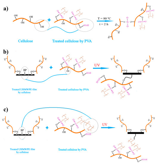 The potential reactions between the modified UHMWPE surface and PVA/Cellulose glue: (a) hydroxyl groups of cellulose and sulfuric acid groups, (b) residual benzophenone and hydroxyl groups of the cellulose of the glue, (c) residual benzophenone and hydroxyl groups of the PVA of the glue.