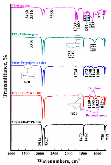 The FT-IR spectra of the virgin UHMWPE film, treated UHMWPE film by cellulose grafting and treated UHMWPE films glued by glues based on thiol-ene reaction, PVA/Cellulose and phenol formaldehyde.