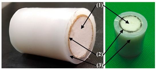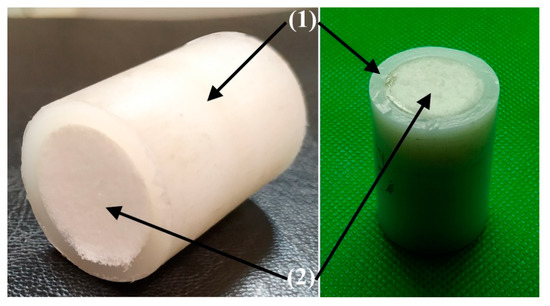 Cylindrical multi-UHMWPE forms samples were prepared by using each type of glues, as shown in Figure 5. Some layers of the UHMWPE films were used as an armored layer between the porous and the bulk layers. All types of glue were used to glue two layers of the UHMWPE films themselves and with the porous and bulk UHMWPE forms. All sample dimensions for each UHMWPE form are shown in Figure 5. In addition, in order to investigate the influence of the layers number of the UHMWPE films on the mechanical properties of the cylindrical multi-UHMWPE forms samples, samples with four and six layers of the UHMWPE films were prepared by using the glue based on thiol-ene reaction.