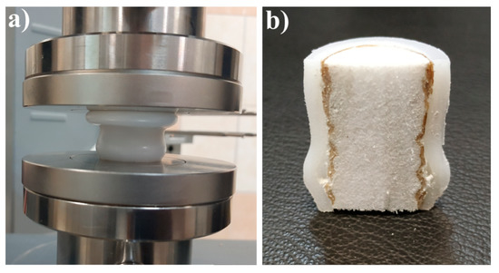 Cylindrical multi- UHMWPE forms samples, made of porous UHMWPE as trabecular layer and armored layer (cortical layer) that consists of bulk and films of UHMWPE. (a) The sample appearance in the end of the mechanical test; (b) dissected sample that shows the fixation of the glued multi- UHMWPE forms after the mechanical test.