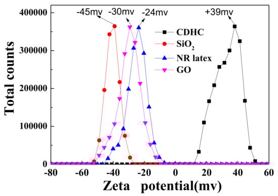 The zeta potential of GO, silica, NR latex, and cystamine dihydrochloride (CDHC) solution.