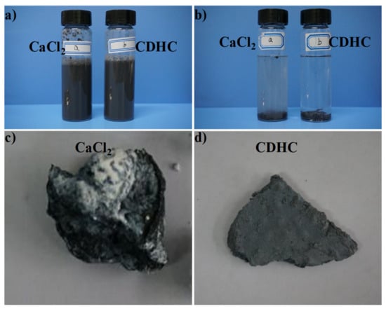 The difference of the coagulation effect of CaCl2 (left) and CDHC (right) on the rGO/silica/NR latex mixture in different periods (a) adding coagulation agents; (b) the coagulated and filtered sample was re-added into water; (c) the CaCl2 coagulated sample; (d) the CDHC coagulated sample.