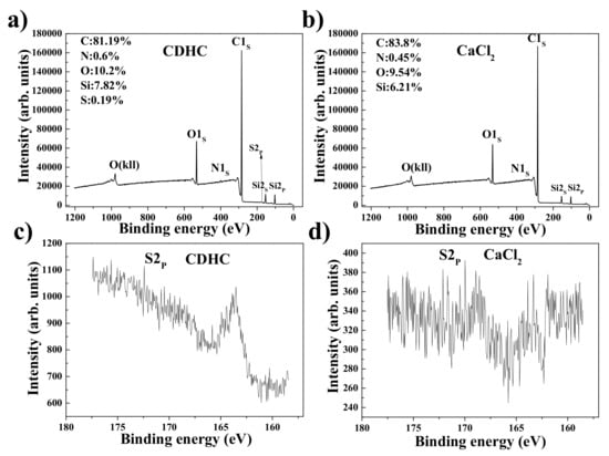 XPS wide scan and carbon narrow scan of the composites which coagulated by (a), (c) CDHC and (b), (d) CaCl2.