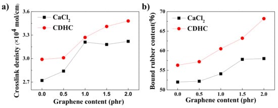 (a) Crosslinking density and (b) bound rubber content of different 60SiO2/rGO/NR composites, which were coagulated by CaCl2 and CDHC.