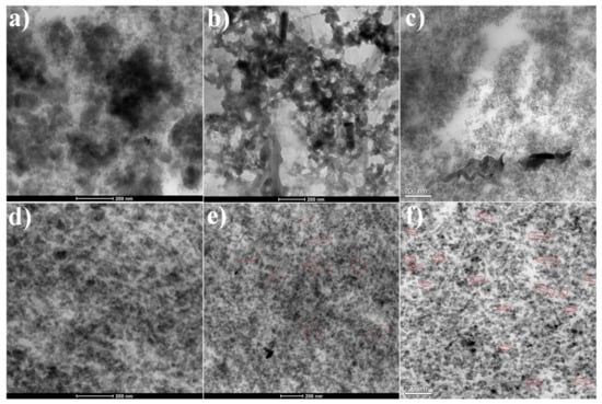 TEM images of the 60SiO2/NR composites prepared by (a) the rubber masterbatch and twin-roll mixing with silica (LMTM) method and (d) WCL method; TEM images of the 60SiO2/1rGO/NR composites prepared by (b) the LMTM method and (e) WCL method; TEM images of the 60SiO2/2rGO/NR composites prepared by (c) the LMTM method and (f) WCL method.