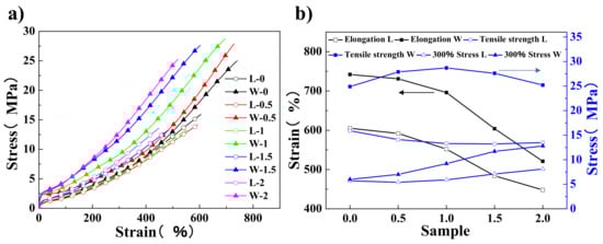 (a) The stress–strain curves of the rGO/60SiO2/NR composites with different rGO contents, prepared by two different methods. (b) The elongation (black line), tensile strength (blue line), and 300% stress (blue line) of different rGO/60SiO2/NR composites made by the WCL (solid point) and LMTM (hollow point) method.