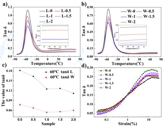 The dynamic mechanical properties of the 60SiO2/rGO/NR composites are shown in Figure 8. The values of tan δ were evaluated by the constant strain mode, and the constant temperature mode for the WCL and LMTM composites are shown in Figure 8a,b, respectively. The addition of rGO causes the reduction of maximum values of tan δ of the composites in both WCL and LMTM methods. This is attributed to the physical and chemical adsorption of interaction on the rubber chain on the surface of the filler, which reduces the chain mobility [37,38]. The Tg of the composites increases slightly with the addition of rGO into the rubber matrix made by WCL method. This suggests that the graphene can disperse well in the silica/rubber matrix made by the WCL method. After adding rGO, the Tg of the composites prepared by the WCL method increases slightly, indicating that graphene has a certain interaction with the rubber molecular chain, which is the result of good dispersion of graphene in the rubber matrix.