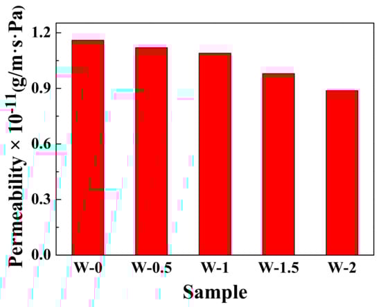 Water vapor permeability data for composites prepared by the WCL method are shown in Figure 9. The water permeability of the rubber composites decreased by increasing the rGO content. When the graphene content reaches 2 wt %, the water permeability decreases by ≈26.1% compared with the composites without graphene. The presence of graphene will increase the diffusion distance and contribute to reduce the free volume of rubber, resulting in enhanced water barrier properties [39,40]. The improvement of the barrier properties of the rubber-based composites is important for expanding the range of applications such as a seal and inner tire.