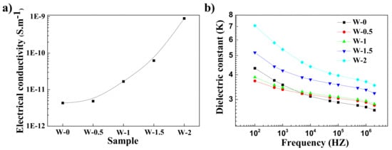 (a) Electrical conductivity and (b) dielectrical constant of rGO/60SiO2/NR composites made by the WCL method.