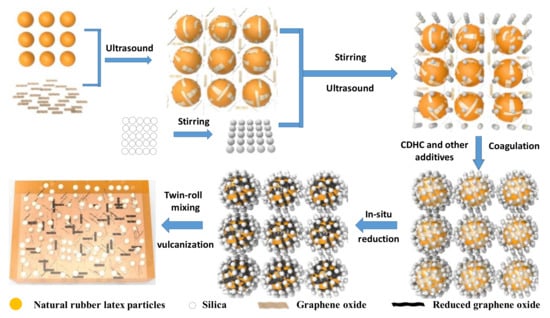 Firstly, the nano-silica was re-dispersed in the deionized water (30 mg·mL−1) by ultrasonic and mechanical stirring for 5 h at room temperature simultaneously. A certain amount of GO was dispersed into deionized water by using an ultrasonic bath at 25 °C for 3 h to prepare 2 mg·mL−1 GO aqueous dispersion. Then, natural rubber latex (NRL) was mixed with the GO solution by sonication for 2 h. After that, the silica dispersion solution was added to the latex, and then the latex mixture was agitated by mechanical and ultrasonic mixing for 2 h. Then, the other vulcanization additives with surfactant OP-10 (the formula is given in Table 1), which were pre-emulsified by a high-speed mixer (ULTRA-TURRAX IKA T25, Staufen, Germany), were added and dispersed in latex mixture by ultrasound and stirring for 2 h. Then, the CDHC solution was dropped into the latex for coagulation. Then, hydrazine hydrate was added to the system under ultrasonic and mechanical stirring for 2 h at 60 °C, in order to reduce GO to rGO in the system. The resulting coagulated SiO2/rGO/NR solid was filtered and washed with water several times and vacuum-dried in an oven at 60 °C for 30 h. The dried SiO2/rGO/ NR solid was mixed for 5 min in an open twin-roll mill (LRM-S-150, Labtech, Samutprakarn, Thailand) at room temperature with a friction ratio of 1:1.1 and a nip gap of about 0.5mm. The mixed pastes were compressively molded at a temperature of 150 °C and a pressure of 15 MPa for the optimum curing time, and they were cooled under a pressure of 10 MPa to room temperature for 3 min to get the different vulcanized samples. The preparation process is shown in Scheme 1.