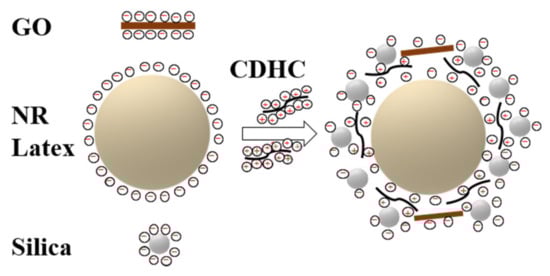 Zeta potential allows evaluating the stability of colloid and the interaction force between colloid and solute additives. Figure 2 shows the zeta potential for the fillers and CDHC used for the preparation of rubber composites with GO. The results show that silica and NR latex are negatively charged, while the CDHC solution is positively charged. Therefore, CDHC can form strong electrostatic interactions with rGO, silica, and NR latex particles, which will destroy the stability of latex and cause the coagulation of all components. The coagulation mechanism of CDHC is shown in Scheme 2.