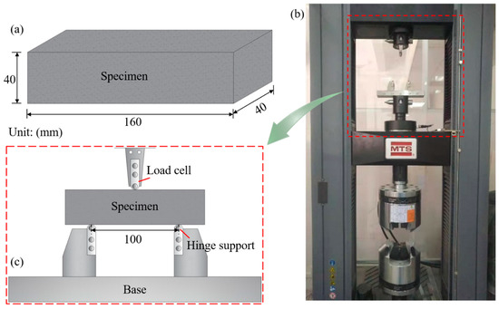 After center aligning a load cell, a specimen, and a base as shown in Figure 1c, preloading was first performed at a rate of 2.0 mm/min according to the displacement of the load cell till loading force increased to 0.01 kN. Then, the loading was start at a rate of 1.0 mm/min and the load-deflection response of the specimen at its midspan was recorded by the sensor installed in the load cell. Meanwhile, a high-definition camera was set in front of the specimen to capture its fracture process. Loading would be stopped when the loading force dropped to ten percent of its peak value.