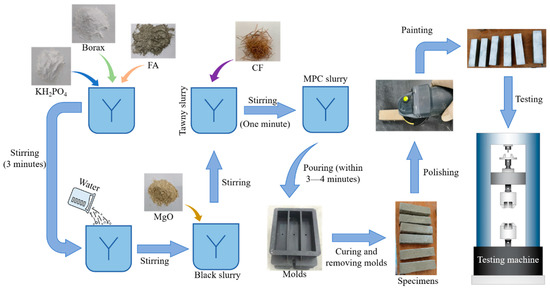 In the preparation of specimens, KH2PO4, borax, and fly ash (FA) were first mixed and stirred for about three minutes. When these three materials were mixed well, water was poured into the mixture, and stirred continuously until the mixture turned to a homogeneous black slurry. Then, MgO was added and the slurry was agitated for two minutes. When the slurry turned from black to tawny, CF was dusted and then mixed well with the slurry for about one minute. At last, the mixed MPC slurry was pumped into the molds within three to four minutes. When the MPC slurry solidified completely (after approximately half to one hour), the molds were removed and specimens were cured in the time corresponding to the test requirement. Figure 2 explains the whole preparation process mentioned above.
