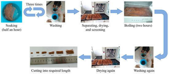 CF applied in this study was from Sri Lanka, provided by Jia Gao Cheng (Import and Export) Trading Co., Ltd. in Jiangxi, China. Its physical properties are offered in Table 5. Before being used, CF was specially treated following the process as in Figure 3. It had been first soaked in water for thirty minutes and then washed to soften itself and remove its impurities. After repeating this soak-wash step for at least three times until the CF was cleaned and intenerated completely, it was separated with a steel comb. Then, these separated CFs were dried in a drying oven for ten to twelve hours at thirty degrees Celsius. Each CF was inspected after drying, and only the CF with a relatively uniform diameter along their axis were adopted in test to be further boiled for two hours and washed in cold water until the water ran clear. Last, these fibers were dried following the same method mentioned above and then cut to the lengths shown in Table 1.