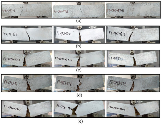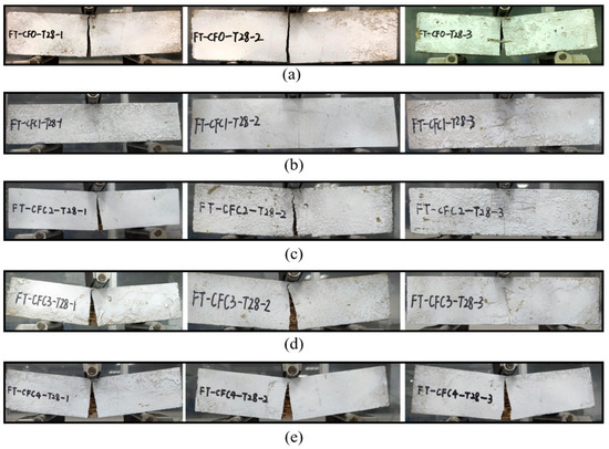 Some initial signs of ductile failure, i.e., type II, could be found when a few CFs were added into the specimens. In CFC1-T7, Figure 5b, cracks occurred later than those fissures in CF0-T7 and grew relatively slowly to wider clefts. In addition, a few CF could be observed in the clefts, holding the two separated parts of CFC1-T7. With increasing CF amounts, as in Figure 6c–e, ductile failure was more obvious. For example, CFC4-T7 presented a typical ductile failure of type III. These specimens failed late, and cracks crept from their bottom to the top at the midspan. Finally, interstices with a larger width occurred in the specimens. Lots of CF stayed in these interstices, preventing specimens from breaking up.