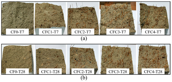 For specimens at 28 days, group T28, they presented a similar trend of flexural strength with group T7, as described in Figure 9a. When CF grew to 3%, AFS increased to the maximum of 13.49 MPa, and then decreased as CF grew continuously. Additionally, relative increments for group T28 after adding CF was smaller than that of group T7. In the cases of 3% CF, AFS was raised by 15.7% in CFC3-T28, but improved by 22.2% in CFC3-T7. This may be a contribution of larger flexural strength for set CF0-T28 because of the fuller hydration.