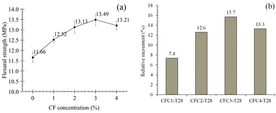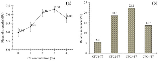 where fcl is the flexural strength, P is the peak load, L is the distance between two supports, b is the specimen width, and d is the specimen depth. Figure 8a offers the average flexural strength (AFS) of specimens at seven days (group T7). It is obvious that appropriate concentration of CF could improve the flexural strength of MPC. As presented in Figure 8a, AFS increased from 5.98 to 7.31 MPa when CF concentration grew to 3%. Meanwhile, its relative increment to CF0-T7, as in Figure 8b, was 22.2%. However, both improvements were cut off at CF continuous increase. When CF concentration was 4%, AFS and its relative increment reduced to 6.8 MPa and 13.7%, respectively, although they were still larger than the value of CF0-T7.