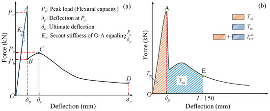 Load-deflection (L-D) curve configuration and schematic for flexural toughness calculation: (a) curve configuration; (b) flexural toughness schematic.