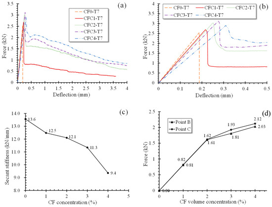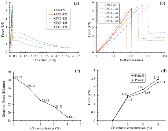 Specimens at 28 days, group T28, had similar L-D behaviors to group T7. However, the threshold of CF concentration, which changed L-D curve configuration, increased from 1% to 2%. In the case of CF level less than 2%, i.e., sets CF0-T28 and CFC1-T28, L-D curves ascended rapidly to the peak load point like a straight line and then dropped sharply along stage A–B till the specimens failed. When CF was further added in proportions larger than or equal to 2%, L-D curves grew again from point B to point C and then declined gradually to point D where the specimen was broken. These could be clearly observed from the L-D curves of group T28 and their enlarged view in stage O–A–B described in Figure 12a,b respectively. As well as for group T7, the secant stiffness of specimens in O–A for group T28 decreased with increasing CF. Meanwhile, point B and point C rose together with the length of stages B–C and C–D when more CF was mixed, demonstrating the increasing of CF’s effectiveness on both counteracting tensile stress in MPC and improving specimens’ ductility. Figure 12c,d clearly present the phenomena mentioned above.