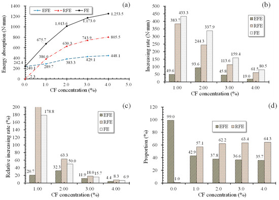 However, those excess CF functioned perfectly well in stages after peak load (point A). As shown in Figure 13d, the proportion of RFE in FE increased from 1.0% to 64.3% when CF grew from 0% to 4%, while the proportion of EFE decreased from 99.1% to 35.7%. Similarly, RFE showed a gradual increase like FE. Note that the data label of 1% CF was not marked in Figure 13c because it had a huge value due to the negligible RFE in the case of 0% CF. Those indicates that CF is able to improve the plastic deforming performance of MPC aside from flexural toughness, which is consistent with the failure process and modes shown in Section 3. Additionally, the increasing rates of EFE were smaller than that of FE and RFE with the same CF, demonstrating more effectiveness of CF on improving plastic deforming performance rather than on improving elastic performance.