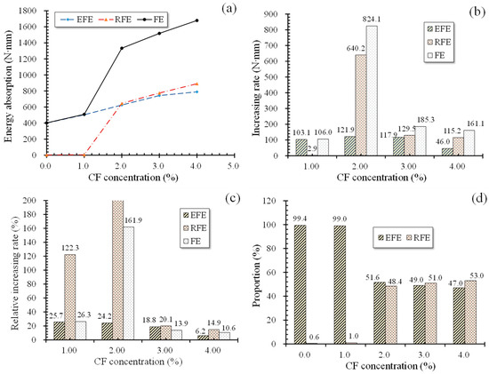 Figure 13a offers the energy absorptions of specimens in different L-D stages. Obviously, FE increased with growing CF levels, suggesting a continuous improvement of the flexural toughness of specimens. However, its increasing rate exhibited a decreasing trend. Note that increasing rate was the energy absorption increment between the specimen with the present CF concentration and the specimen with the prior CF concentration. For example, the increasing rate of 1% CF was the energy absorption increment between specimens with 1% CF and 0% CF. Relative increasing rate was the ratio of the increment to energy absorptions of the specimen with the prior CF volume concentration. As shown in Figure 13b,c, FE increased by 178.8% and 433.3 N·mm when CF grew from 0% to 1% but increased by 6% and 80.5 N·mm when CF quantity rose from 3% to 4%, indicating a decline of CF’s effect on improving MPC toughness as CF increases.