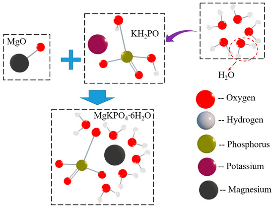To explain mechanical responses described in Section 3, a microanalysis was carried out based on modern microtesting techniques such as scanning electron microscopy (SEM), energy dispersive X-ray detection (EDX), and X-ray diffraction (XRD) to investigate the effects of CF on MPC’s microstructure and hydrated products. It is a well-known fact that, after the exciting of water, MgO undergoes a hydration together with phosphate, combining to produce a new compound named potassium phosphate magnesium (K-struvite) around unreacted MgO [33], according to the process shown in Figure 15.