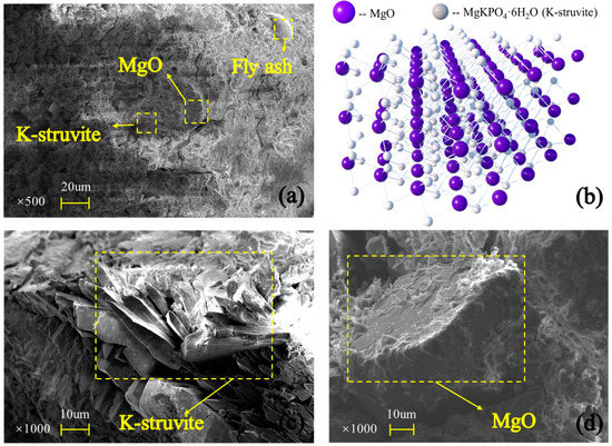 Scanning electron microscope (SEM) results: (a) MPC micromorphology; (b) schematic; (c) K-struvite; (d) MgO.