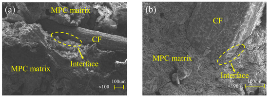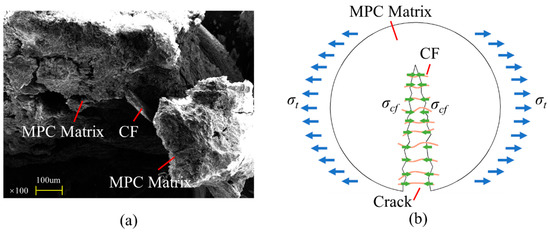In spite of that, tensile resistance would be improved after CF was added into MPC, thanks to the “bridge effect” of CF to connect MPC matrixes comprising those struvite columns. This connection shown in Figure 18a reduced tensile stress in the matrix and prevented internal microcracks from growing according to the schematic presented in Figure 18b by keeping the columns together. Besides, the effectiveness of the bridge effect mainly depended on CF’s bonding property with the matrixes and their tensile resistance.