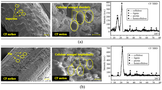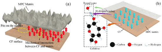 For unwashed and boiled CF, as presented in Figure 19a, some spherical particle-shaped impurities could be found on its surface, gravely weakening the bonding property. Moreover, for untreated CF, its lignin, holocellulose and hemicellulose, the main contents providing CF its mechanical strength, were in disorder arrangement, which was not conductive to CF tensile resistance, too. Therefore, CF was washed and boiled in this study to remove the impurities from its surface. As shown in Figure 19b, nothing could be observed on the CF surface except for continuous pits. In addition, lignin, holocellulose and hemi-cellulose were all arranged longitudinally, and their concentration exhibited a significant growth compared with the case of untreated CF. This rough and clean CF surface contributed to better adhesion between CF and the matrixes through improving the mechanical interaction and hydrogen bonding of the two substances shown in Figure 20a,b, and these regularly arranged CF contents were furthermore beneficial to higher CF tensile strength and toughness [34]. As a result, the effectiveness of the “bridge effect” was ensured to enhance the flexural strength, flexural toughness, and ductility when CF was incorporated.