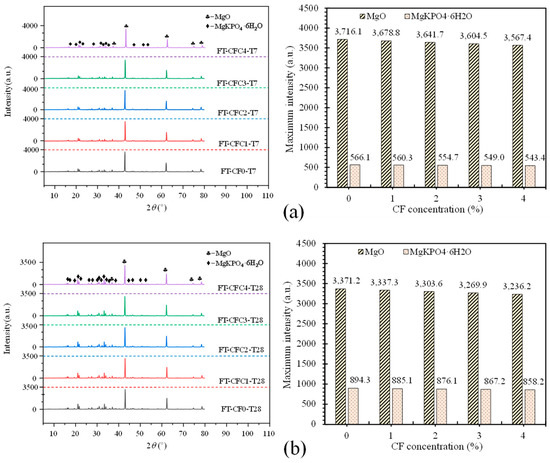 Although the incorporation of CF induced the improvements of MPC mechanical properties because of relying on the bridge effect, it degraded structural compactness of the matrix simultaneously. This degradation came from a significant fluidity reduction of MPC slurry in casting and severe fiber agglomeration problems due to excess CF (exceeding 3% in this study), resulting in larger pores in the matrix. In fact, the incorporation likewise reduced the amount of K-struvite but had no influence on the components of hydration products. Figure 22a,b offer XRD results of specimens at seven days and 28 days. It is clear that, taking T28 as an example, K-struvite intensity decreased from 900.43 a.u. to 840.35 a.u. with CF growing from 0% to 4%, possibly due to the contributions of two reasons: the decreasing of MPC binder (MgO and KH2PO) by CF replacement, and the delayed hydration reaction due to the reduction of water absorbed into CF in the reaction. These reductions of hydration products and the degradation declined flexural strength in turn when excess CF was added and lowered CF effectiveness on improving flexural toughness, as observed in Figure 8, Figure 9, Figure 11, Figure 12, Figure 13, Figure 14.
