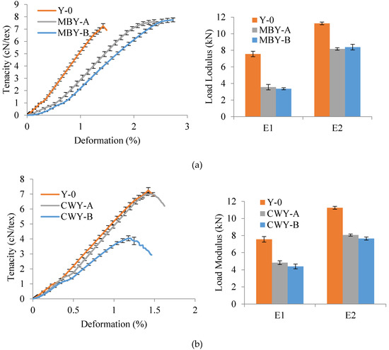 For textile flax hybrid yarns, the mechanical properties cannot be calculated as force per unit area of cross-section as it is very difficult to measure the cross-section for each yarn with natural flax. Consequently, load modulus (kN) was used to quantify the tensile results. The tensile load modulus is calculated as the slope of the initial force vs. deformation curve. From Table 1, we know that the flax roving had high strength but very short deformation, so the breakage of MBY and CWY was firstly the breakage of core flax roving. The fracture of flax roving surface treatment agent divided the curve into two deformation phases: E1 and E2. For MBY, E1 was between 0 and 0.5% and E2 was between 1.4 and 1.8%, while for Y-0 and CWY E1 was between 0 and 0.2% and E2 was between 0.5 and 1% since the deformation of pure flax is extremely short. The representative results of dry-state tensile tests are shown in Table 3 and Figure 5.