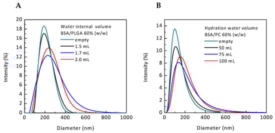 Taking into account the two proposed nanosystems, EE was higher in the case of PNPs. The highest EE value (98.01 ± 0.05%) was obtained working with 1.5 mL of water internal phase and a final BSA concentration in the water solution equal to 40 mg/mL. Figure 1A,B report PSD of PNPs and NLPs, respectively. The loading of BSA did not interfere with PSD.